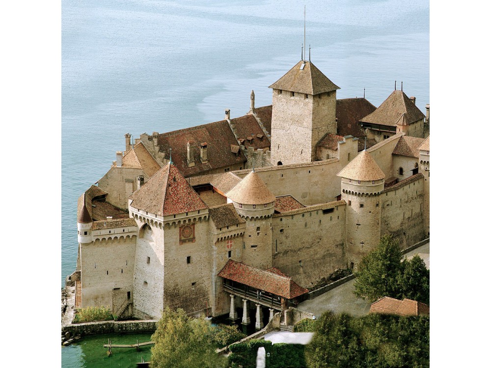 El castillo de Chillon está construido sobre una roca ovalada de piedra caliza que se adentra en el lago Lemán, entre Montreux y Villeneuve, con una pendiente escarpada a un lado y el lago y su abrupto fondo en el otro.