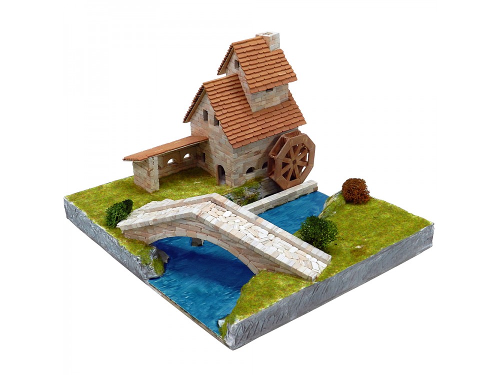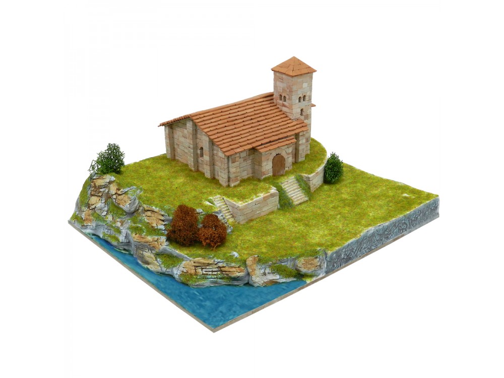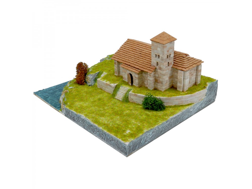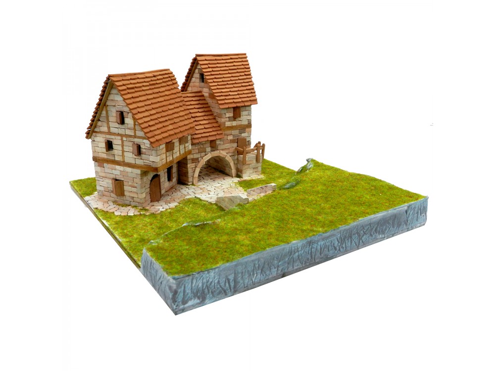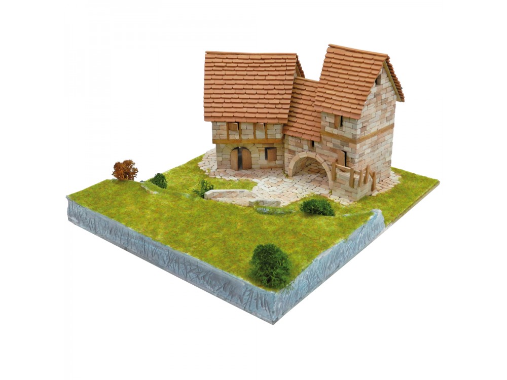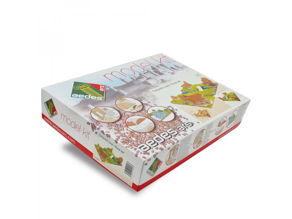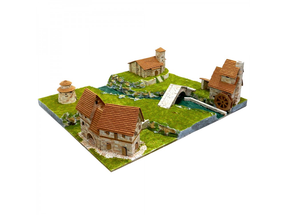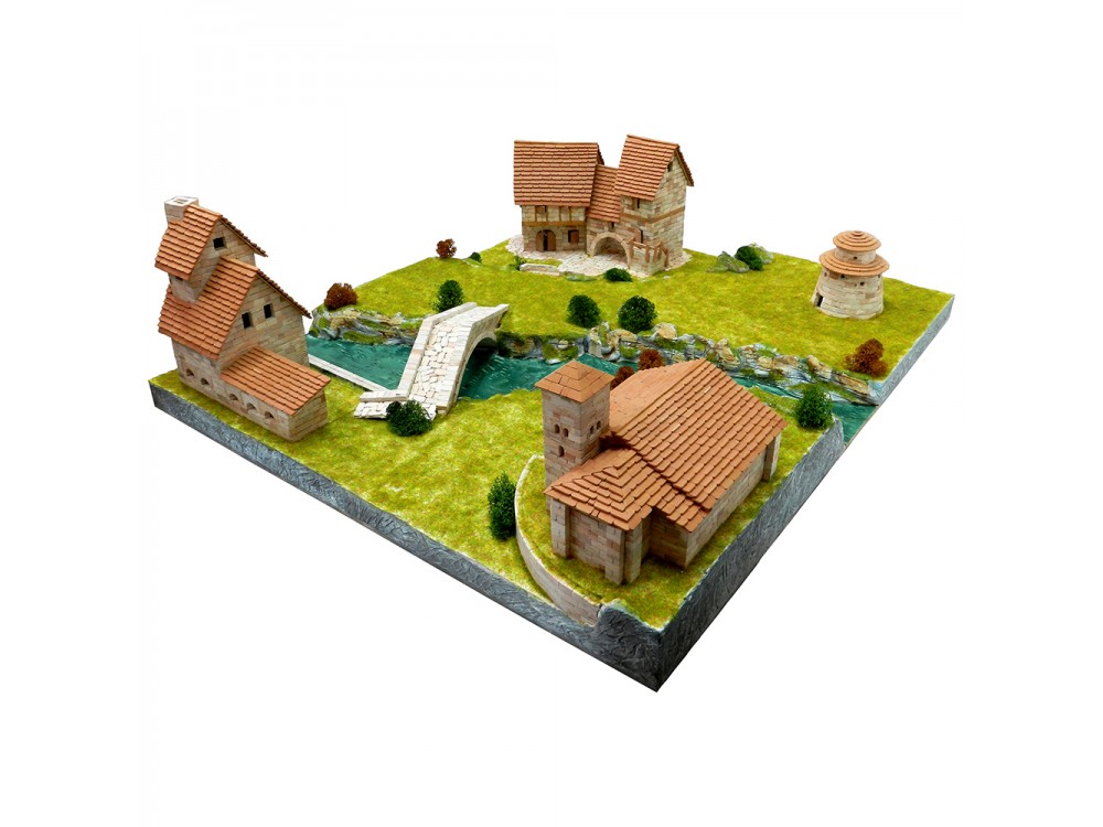 Kit de construcción del conjunto rural. Incluye las ref. 01107 (Iglesia de Santa Cecilia), 01408 (Viviendas rurales), 01409 (La forja con puente) y un granero.