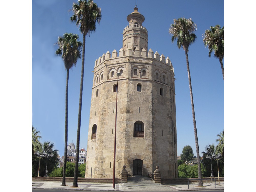 La Torre del Oro, situada a orillas del río Guadalquivir, es uno de los monumentos más emblemáticos de Sevilla y un testimonio vivo de su pasado histórico. Construida en el siglo XIII por orden de la dinastía almohade, formaba parte del sistema defensivo de la ciudad junto con las murallas y otras torres. Su función principal era la de vigilar la entrada al puerto fluvial y controlar el tráfico de embarcaciones, asegurando así la protección y el comercio de la ciudad.